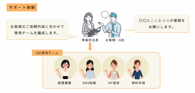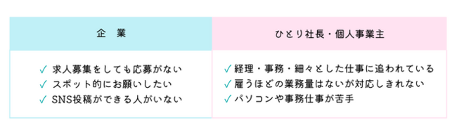 人手不足に悩む社長や、ひとり雇うまでもない業務量を対応してほしい、育休産休で生じた欠員のスポット的な依頼、面倒な作業をまるごとお任せしたいなど、大手企業ではできない様々な状況に応じてフレキシブルに対応可能です。