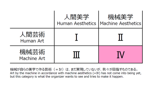 美学を、人間のそれと機械のそれに分ける。芸術を、人間のそれと機械のそれに分ける(図)。そうして生じた4つの部門のうち、機械、または未来のAIが自らの美学と美意識で芸術創作する「機械美学/機械芸術」(IV)は、われわれ人類にとっては脅威かもしれないが、驚異でもあるだろう。