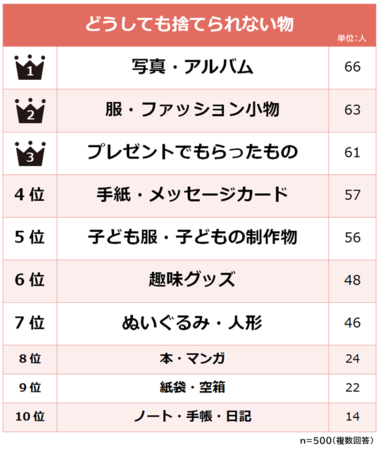 アンケートの結果、「写真」「プレゼントでもらったもの」「子ども服」など、思い出があるものは捨てにくいと感じる人が多いとわかりました。