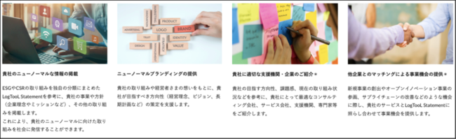 サービスには、ニューノーマルブランディング支援やメディアによる情報掲載などをご用意しております。この度のプレリリースでは、情報の発信やブランディング支援に関するサービスの提供を開始いたします。詳しくはLogTooLサービスページをご覧ください。