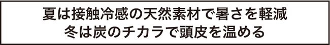 冬の寒さによる頭皮の冷えを軽減するため、超長綿を高温で炭素化させて、炭の繊維と綿糸を丹念に撚った糸「SUMISEN(R)」を使用。