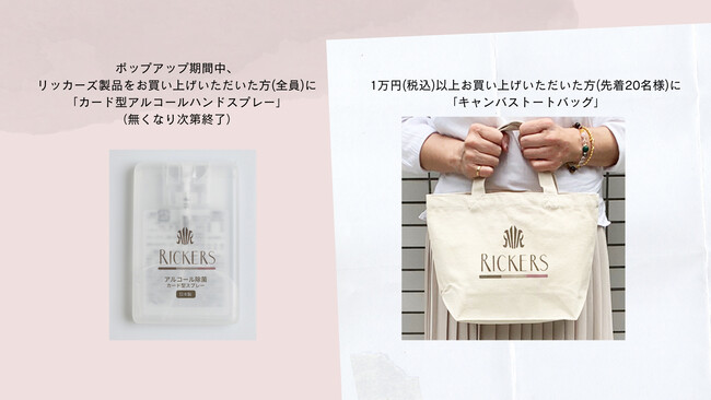 ポップアップストア限定で、お買い上げいただいた方全員に「RICKERSオリジナルカード型アルコールハンドスプレー」と「RICKERS人気商品が当たる『新春宝くじ』」を配布。