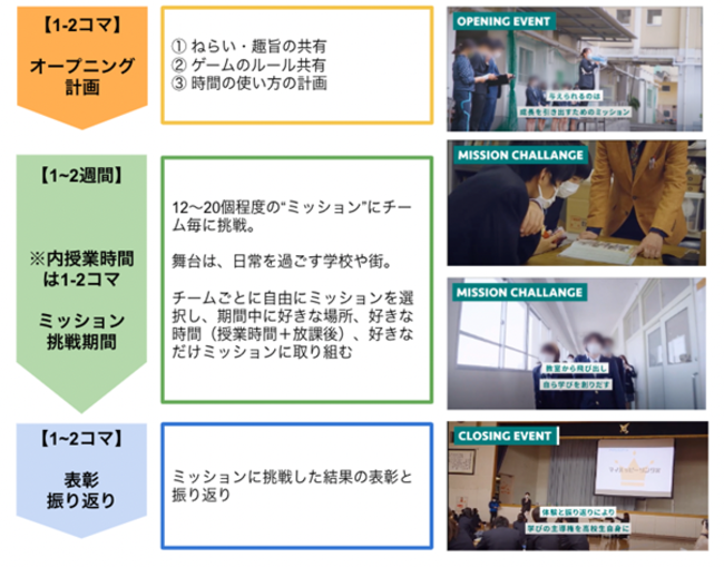 「ワンダリングチャレンジ for school」は高校生が3人1組のチームを組み、あらかじめ提示された様々な「ミッション」をクリアしていくゲーミフィケーション型探究プログラムです。米スタンフォード大学教授が提示した理論をヒントに台湾で開発されたプログラムを、ウィルドア/ETIC.が初めて日本にローカライズをしたもので、2020年から現在まで約3000名の高校生が参加しました。