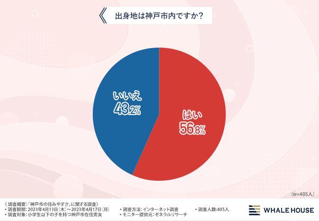 「出身地は神戸市内ですか?」と質問したところ、『はい(56.8%)』『いいえ(43.2%)』という回答結果になりました。