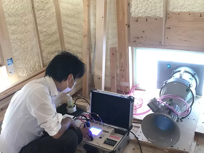 高気密・高断熱を掲げる一般的なハウスメーカーよりも、当社はさらに厳しい基準で隙間を無くすことを追求し、家中の隙間をはがき0.5枚以下である隙間相当面積C値0.5平方センチメートル/平方メートル 以下をクリアしないと次の工事工程に進めないシステムとなっております。