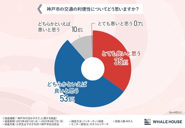 「神戸市の交通の利便性についてどう思いますか?」と質問したところ、『とても良いと思う(35.1%)』『どちらかといえば良いと思う(53.6%)』『どちらかといえば悪いと思う(10.6%)』『とても悪いと思う(0.7%)』という回答結果になりました。