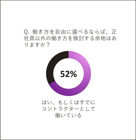 日本でスキルを持つ求職者の方々に向けて行った調査では、参加者の74%が現在正社員として働いているものの、全体の75%がコントラクターとして働くことを検討すると回答しました(すでにコントラクターとして働いている人を含む)。これは、現在正社員として働いている方の中でも少なからぬ数の方が、コントラクトでの仕事に興味を持っていることを示しています。