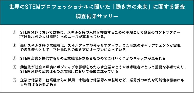本調査の目的は、欧米諸国と比べて独特な文化をもつ日本市場において、今後多様な働き方へのシフトが見られるのかを明らかにすることです。その調査結果から結論づけられた日本を含む世界共通の大きなトレンドの一つとして、「STEM分野におけるコントラクター*へのニーズの増加」が明らかになりました。