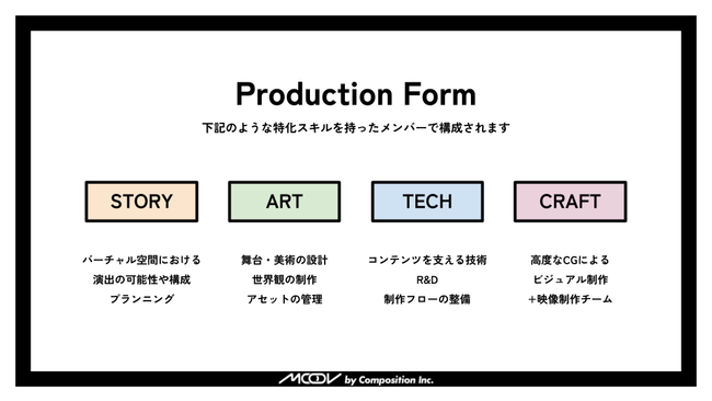 株式会社CompositionおよびMOOVは、株式会社スタジオSoup.とも連携し、バーチャル・メタバース時代にふさわしい、新世代のクリエイティブスタジオを目指してまいります。