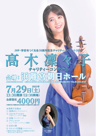 JHP・学校をつくる会(正式名称:特定非営利活動法人JHP・学校をつくる会)は、創立30周年記念イベントとして、7月29日(土)浜離宮朝日ホールにて、「高木凜々子チャリティコンサート」を開催いたします。