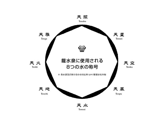 全ての龍水泉商品は、「軟水同士」「軟水と硬水」といった具合に複数の水を掛け合わせ、各商品にとって最適解な仕込み水を用意しており、商品名の頭に<天照・天雅・天星・天空・天火・天風・天水・天地>のいずれか、水を表す独自の称号が付されます。