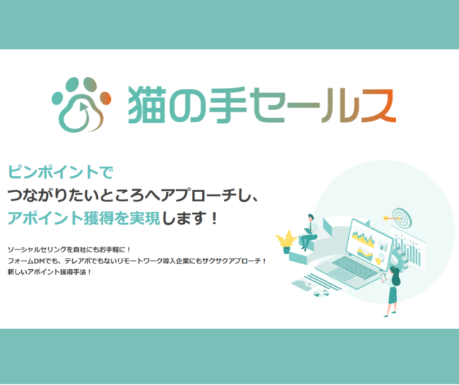 営業支援、DX事業を展開するTagMo合同会社(本社:神奈川県川崎市、代表社員:久保 智也 以下当社)は、月額5万円で、フォームDMでも、テレアポでもないリモートワーク導入企業にもサクサクアプローチできる新しいアポイント獲得手法「猫の手セールス」をリリース致しました。
