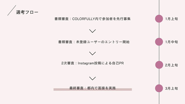 「COLORFULLY」に既にご登録いただいているユーザーを対象に、コンテスト参加者を先行募集。登録情報(プロフィール、宣材写真、SNS等)で選考を行います。