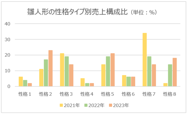 2023年雛人形商戦の前半戦(2022年11・12月)の顧客データを集計し、過去2年間の雛人形の顧客データと比較した結果、お客様が好む雛人形の顔タイプ(性格分類)が、「元気」「明るさ」から「やさしさ」「安らぎ」にシフトしていることが分かりました。