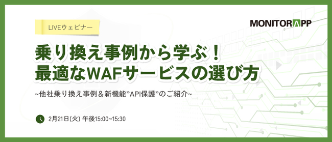 クラウド型SECaaSソリューション『AIONCLOUD』を提供する、統合アプリケーションセキュリティ専門企業の株式会社モニタラップ(日本法人:東京都千代田区、代表:金 暎埈 (キム・ヨンジュン)は、2023年2月21日(火)に「WAFサービス」と「API保護機能」をテーマとした無料ウェビナーを開催いたします。
