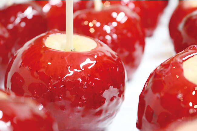りんごだけでなく、いろいろな食材で作ることを革新した福留店長。季節ごとにさまざまなフルーツ飴が登場します。現在展開しているメニューはりんご飴・プレーン(550円)、りんご飴・シナモン(650円)、いちご飴(500円)、ブドウ飴(550円)、トマト飴(450円)。これからは、りんご飴のホワイトチョコや意外な食材を使った飴も登場予定。
