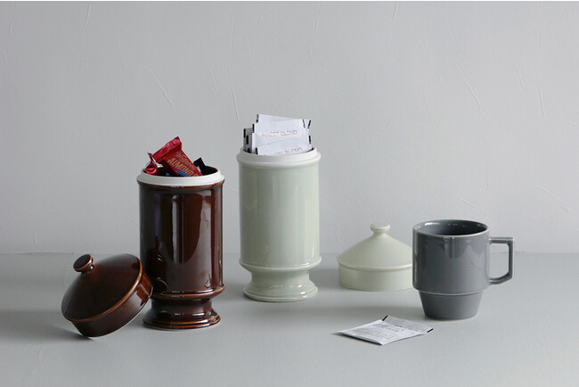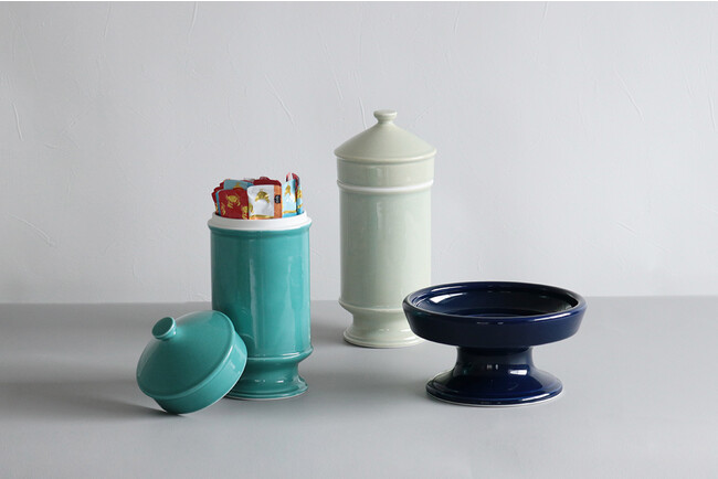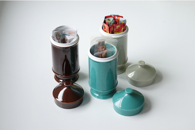HASAMIスナックキャニスターは、猫のおやつの収納にぴったりの既製品がなく苦労していたマルヒロ社員の経験から誕生したアイテム。海外のガラスのキャンディジャーのような磁器製のキャニスターで、脚付きのスリムなボディは場所も取らず美しい見た目です。