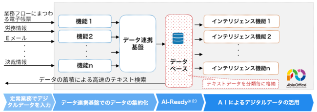※1)データ連携基盤とは、複数のシステムに蓄積されたデータを収集・加工して、各システムで利用できるようにするための仕組みです。ここでは機能毎に蓄積されたテキストデータを集めてデータベースに格納します。その格納されたテキストデータをAI等で利用することが可能になります。