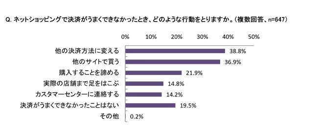 購入過程においては、決済がうまくできなかったことはないと回答した消費者は19.5%にとどまり、何らかの形で決済がスムーズに行われなかったことがある消費者が8割以上ということがわかりました。その際にとる行動としては「他の決済方法に変える」のほか、36.9%が「他のサイトで買う」、21.9%が「購入することを諦める」と回答しました。