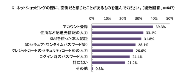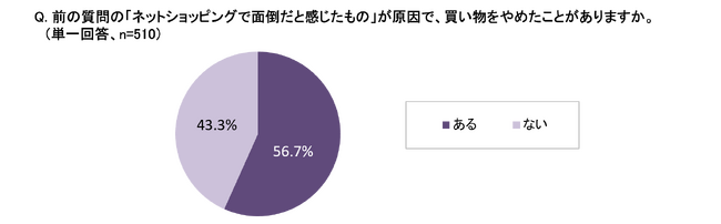 ネットショッピングをする際に、何らかのものに面倒だと感じたことがある消費者は78.8%で、若い世代ほど 「配送先情報の入力」「3Dセキュア」「SMSを使った本人認証」を面倒に感じる傾向にあることがわかりました。また、56.7%の消費者が、ネットショッピングの際に面倒だと感じたものが原因で買い物をやめたことがあると回答しました。