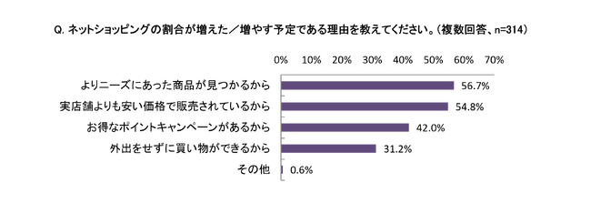 昨今の物価上昇をうけて、48.5%の消費者が、買い物全体にしめるネットショッピングの割合が増加傾向にある・または今後増やす予定と回答し、若い世代ほどその傾向が強くみられました。理由として、過半数の消費者が「よりニーズにあった商品が見つかるから」 「実店舗よりも安い価格で販売されているから」と回答しました。
