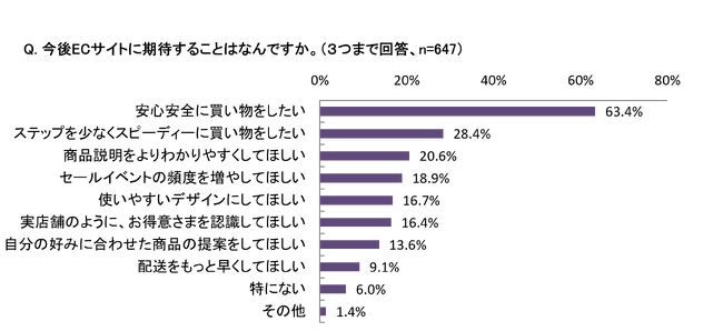 また、今後ECサイトに期待することについては、「安心安全に買い物をしたい」が63.4%で最多回答となり、「ステップを少なくスピーディーに買い物をしたい」が28.4%で次に続きました。