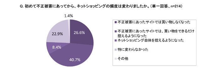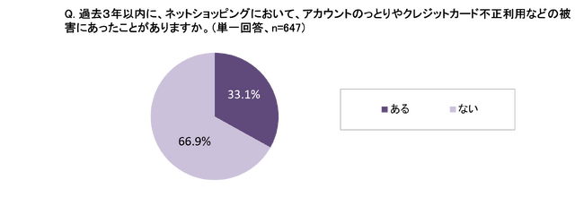 過去3年以内に、ネットショッピングにおいてアカウントのっとりやクレジットカード不正利用などの被害にあったことがある消費者は33.1%でした。そのうち67.3%が、初めて不正被害にあってから、そのサイトでの買い物をしなくなった、または控えるようになったと回答し、8.4%はECサイトの利用自体を控えるようになったと回答しました。