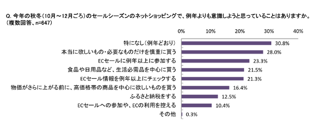 また、今年の秋冬のセールシーズンのネットショッピングで例年よりも意識しようと思っている点については、「例年通り」と回答した人は30.8%で、その他の消費者からは「ECセールに例年以上に参加する/セール情報を例年以上にチェックする」 「本当にほしいもの・必要なものだけを慎重に買う」という回答が多くありました。