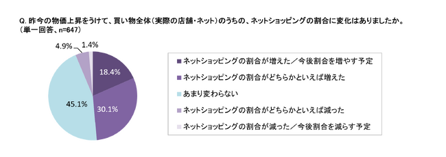 昨今の物価上昇をうけて、48.5%もの消費者が、買い物全体にしめるネットショッピングの割合が増加傾向にある・または今後増やす予定と回答し、若い世代ほどその傾向が強くみられました。