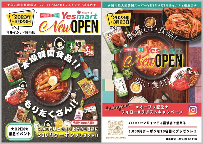 NAO HOLDINGS合同会社(本社:神奈川県横須賀市、代表社員:羅鉉悳)は、北海道から沖縄まで、日本各地で展開している国内最大級の韓国スーパー「Yesmart」のフランチャイズ店『Yesmartマルイシティ横浜』を、2023年3月23日(木) 10:30に グランドオープンします。
