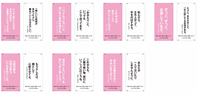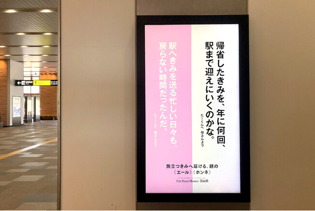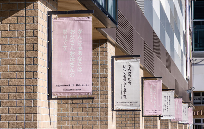本プロジェクトでは、県外に進学・就職する若者へ向けて、保護者からの応援メッセージ(エール)と子供が自立していくことで感じる寂しさ(本当の気持ち)を富山県が集め、富山駅前の商業施設「MAROOT(マルート)」を中心に、外壁の懸垂幕や施設内のデジタルサイネージ、隣接する通りのフラッグ等の43箇所に掲出。また、同時にプロジェクト特設ページを開設し公開します。