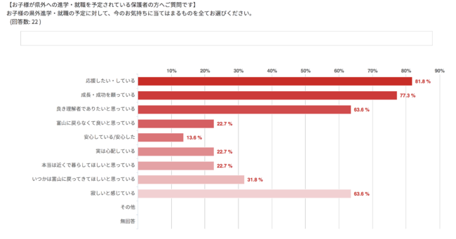 本プロジェクトを実施するにあたり、富山県は事前に高校生・大学生の子供をもつ保護者の方々にアンケートを実施※。その中で、県外へ進学・就職を予定している学生の保護者の方々に「今のお気持ち」を聞いたところ、「応援したい・している」が80%強で最も多い一方、「成長・成功を願っている」と「寂しいと感じている」が同数で60%強という結果が出ました。また、「いつかは富山に戻ってきてほしいと思っている」が約30%強、「本当は近くで暮らしてほしいと思っている」が20%強あり、巣立っていく子を持つ親心が改めて浮き彫りとなりました。