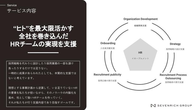 私たちは、企業のHR領域を支援する際、採用戦略の設計や採用業務の一部を請け負うだけでは、一時的に成果が表れたとしても、本質的な支援ではないと考えています。理想とする事業計画から逆算して、いま足りていないHR領域の要素を弊社が担いながら、そのノウハウの内製化を進め、強いHRチームの創出を目指しご支援していきます。