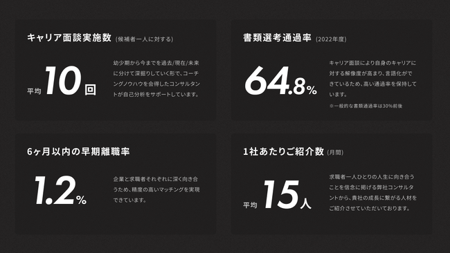 担当するコンサルタントは全員共通でコーチングのノウハウを会得しています。平均10回ほど行う面談のなかで、多角的な質問や思考のフレームワークを活用し自己分析を伴走することで、求職者が万全な状態で面接に臨めるようサポートします。