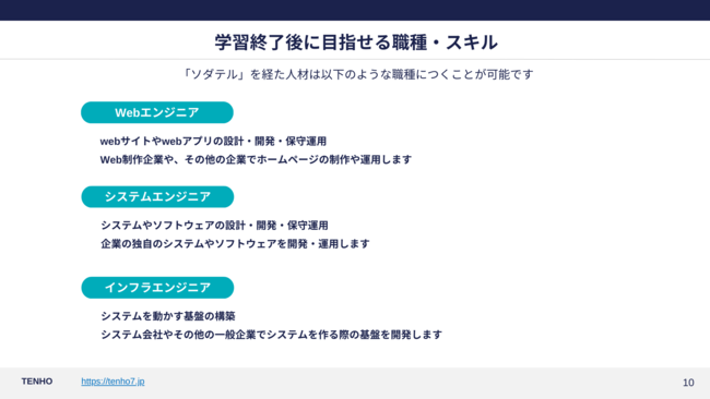 ソダテルは以下のように、「Webエンジニア」「システムエンジニア」「インフラエンジニア」の3つの職種を育成します。