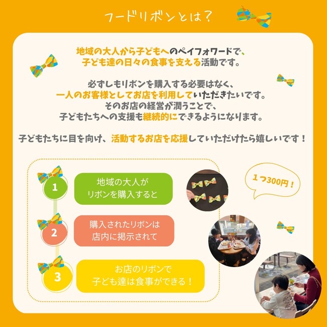 300円のリボンを購入する支援することで、子ども達の1食がつながれていきます。フードリボンのお店を利用するお客様、地域の大人がもつ社会貢献意欲をかたちにする「やり方」と「やり場」を提示することで、地域と共に子ども達を支え、応援する文化ができていきます。