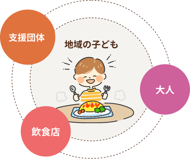 大人たちからの“寄付”によって、食事や見守りを必要とする家庭にチケットを発券します。チケットのお渡しや使用を、地域の支援団体や飲食店とのやり取りを必要とすることで、食事を通して、見守りを必要とする家庭やこどもたちが地域の人たちとつながる機会をつくります。