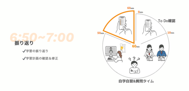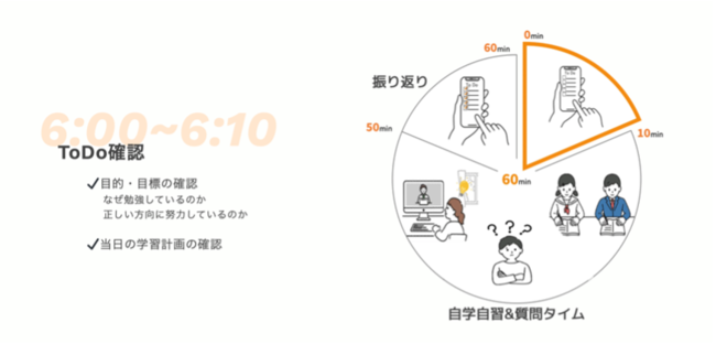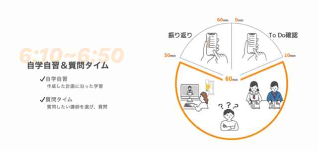 集団学習および講師と1on1による質疑応答の両方を実施し、毎朝の学習習慣を身に付けることによって、1日の時間を有効活用できる「一生モノ」の学習習慣を身につけます。