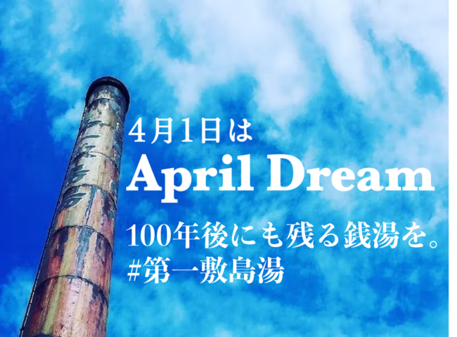 当社は、4月1日を夢を発信する日にしようとするApril Dreamに賛同しています。このプレスリリースは「第一敷島湯」の夢です。第一敷島湯(所在地:兵庫県尼崎市杭瀬本町、代表:黒木 達也)は、「100年後に続く銭湯や銭湯文化」を夢として掲げ、魅力的な銭湯づくりやイベントの開催を行います。