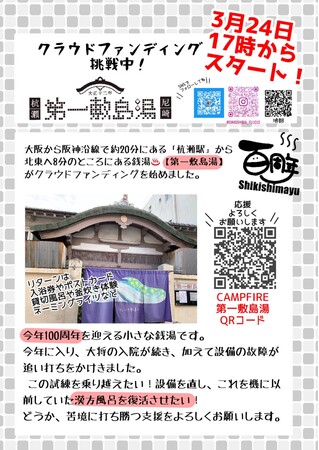 2023年3月24日からCAMPFIREにてプロジェクトスタート。第一敷島湯の存続危機を救い、漢方湯を皆様に提供するために、皆様のご協力をお待ちしております。クラウドファンディング実施期間:2023年3月24日(金)~2023年4月26日(水)プロジェクトページ(CAMPFIRE):https://camp-fire.jp/projects/view/658697