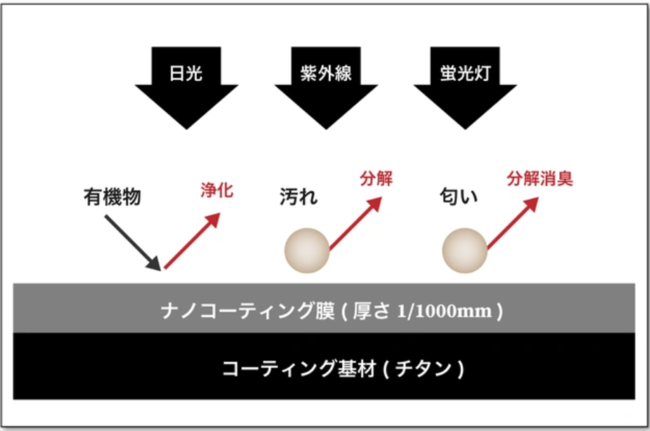 この表面に日光や蛍光灯の光が当たると、強力な抗菌効果が発現します。