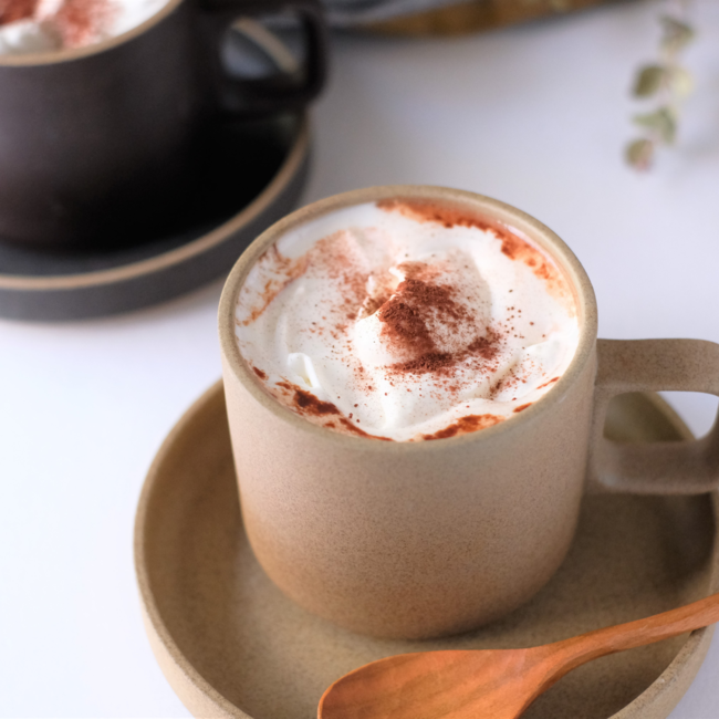 材料:純ココア、もち麦とゆず甘酒、水、【甘酒ホイップ】 生クリーム 、もち麦とゆず甘酒適量