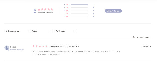 従来のサイトにはなかったレビュー機能を追加、またレビュー投稿の手軽さを追及する事で、検討中のお客様には実際にエコー写真ポスターを制作していただいた方の感想から作成のイメージをしていただけるようになりました。