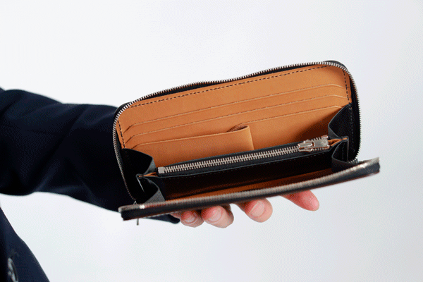 長財布の魅力は収納力です。従来のラウンドジップ長財布では無駄になっていたスペースをうまく削る事により、小さいのに大容量を実現することができました。
