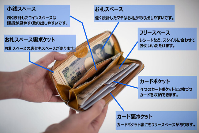 1万円札がピッタリ入るまで小さくして、なおかつ、使いやすい構造にしました。