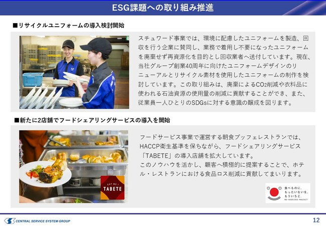 当社スチュワード事業が業務を請負う全国のホテル約170か所のうち、宴会場・レストランを併設する32のホテルにおける当社調べの稼働対前年比(2023.1/2022.1比)、レストラン入客数 31.0%アップ、宴会入客数 2.1倍、婚礼宴会入客数 53.4%アップという数字に示されるように、ホテル・レストラン・観光・レジャービジネスの復調に牽引さる形で営業収益は急伸いたしました。また、感染拡大防止策の徹底を継続するとともに、サービス事業の基本である安心・安全への不断の努力、過剰な消費の抑制や廃棄物の削減、従業員の働きがいや心理的安全性への配慮などにも積極的に取り組んでまいりました。