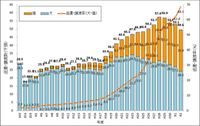 環境省が掲示したデータによると、コロナウイルスが感染拡大した2020年にペットを譲渡した人は、前年の61.8%から68.5%に増加しています。