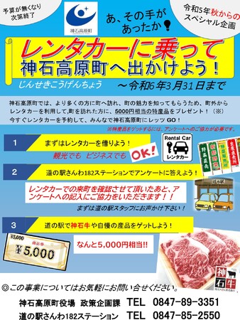 広島県神石高原町では、地域公共交通網の不足を補い、広く町外に向けて、レンタカーによる来町手段をPRすることで町への誘客等を図るため、レンタカーを利用しての来町者に対し5,000円相当の特産品を進呈する事業を10月から試験的に実施することと致しました。