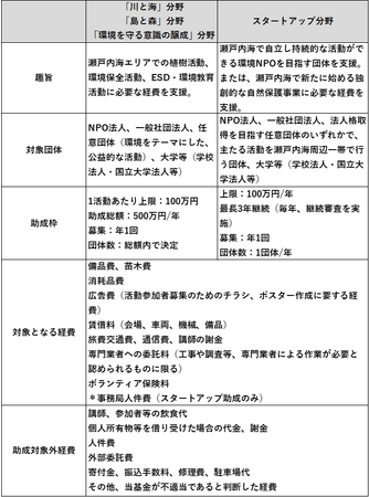 NPO法人、一般社団法人、法人格取得を目指す任意団体のいずれかで、主たる活動を瀬戸内海周辺一帯で行う団体、大学等(学校法人・国立大学法人等)