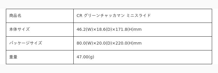 「CRグリーンチャッカマン ミニスライド」はスライドタッチ式を採用しており、チャイルドレジスタンス機能を持ちながらも従来のハードプッシュタイプと比べ着火しやすく指も痛くなりにくいソフトタッチ。